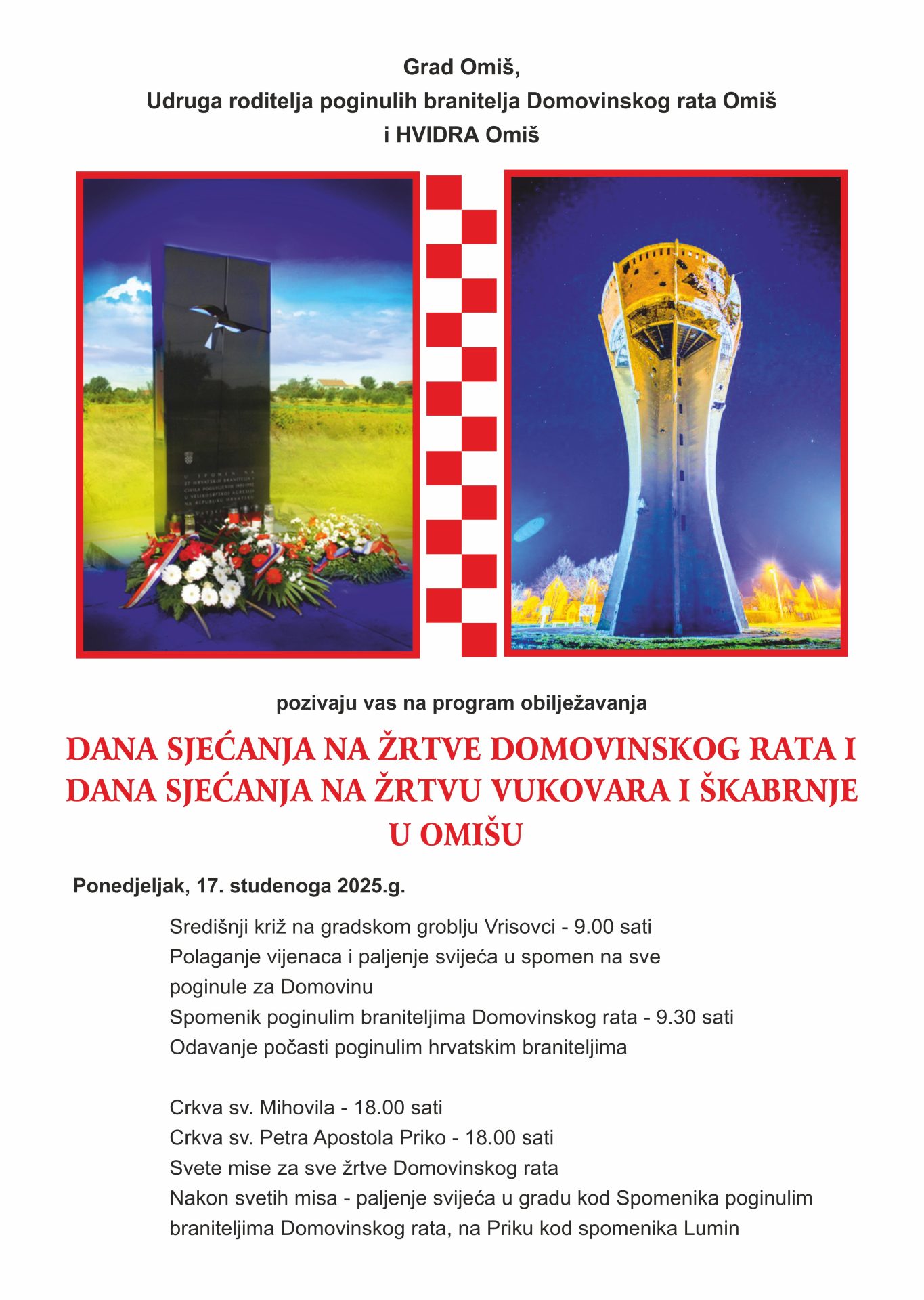 Povodom obilježavanja Dana sjećanja na žrtve Domovinskog rata i Dana sjećanja na žrtvu Vukovara i Škabrnje, Grad Omiš će odati počast žrtvama Vukovara i Škabrnje te svim žrtvama iz Domovinskog rata.