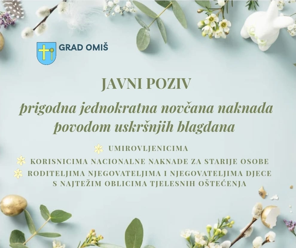 Grad Omiš objavljuje Javni poziv za podnošenje zahtjeva za ostvarivanje prava na prigodnu jednokratnu novčanu naknadu korisnicima mirovina, nacionalne naknade za starije osobe, roditeljima njegovateljima i njegovateljima djece s najtežim oblicima tjelesnih oštećenja u 2026. godini povodom uskršnjih blagdana.