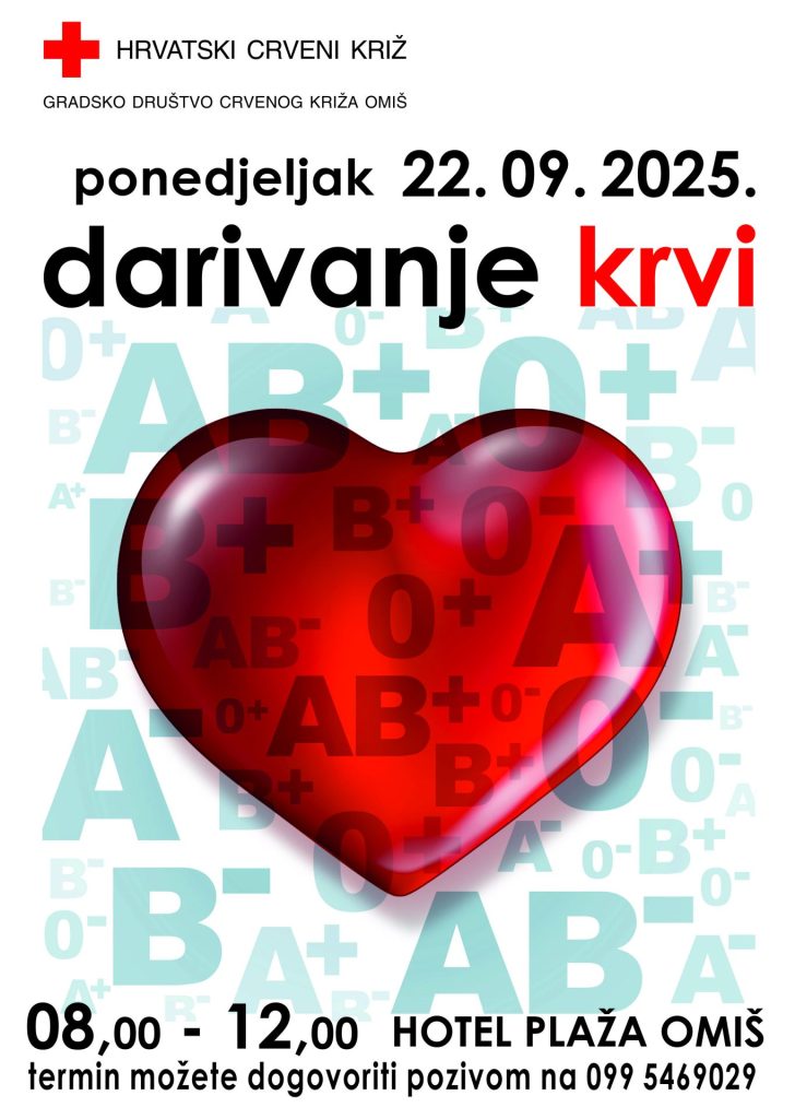 Gradsko društvo Crvenog križa Omiš organizira akciju darivanja krvi dana 22. rujna (ponedjeljak).